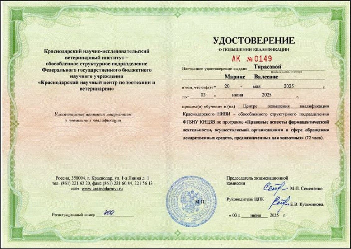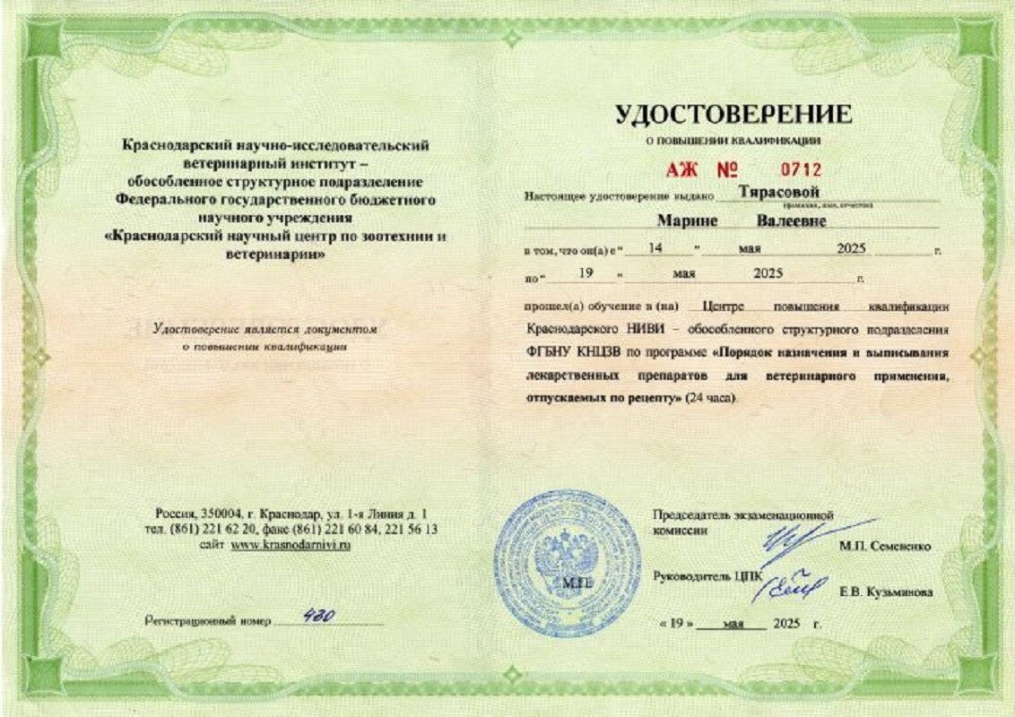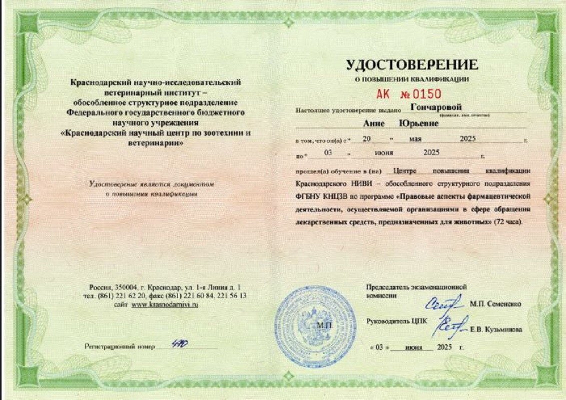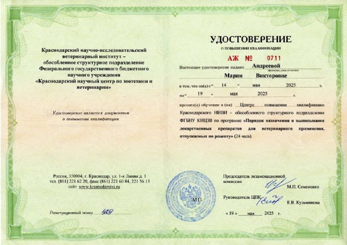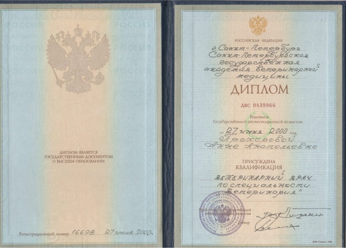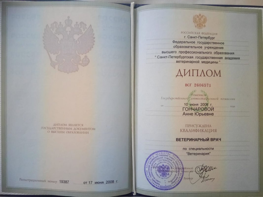 Повышение квалификации: слушатель вебинаров, участник конгрессно-выставочных мероприятий на базе Санкт-Петербургского ветеринарного сообщества.