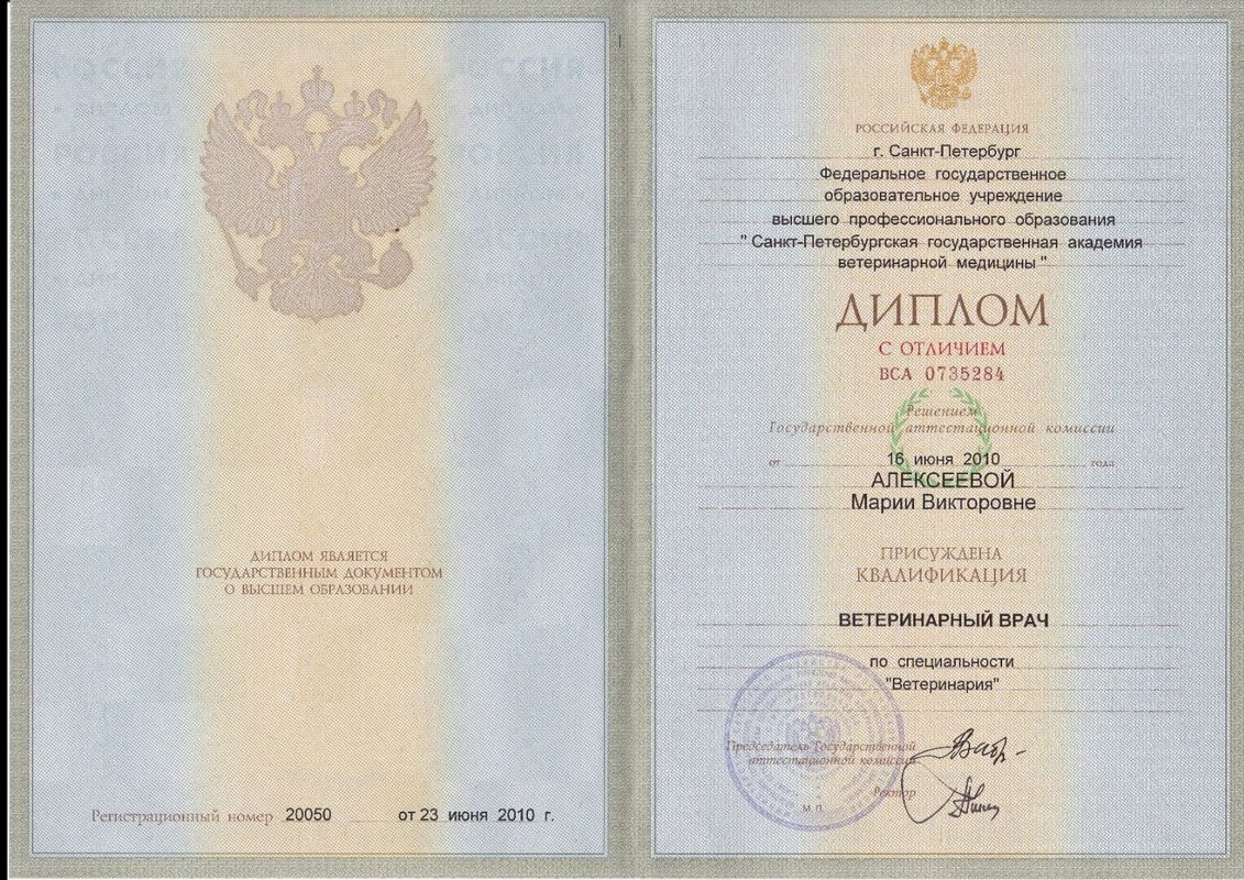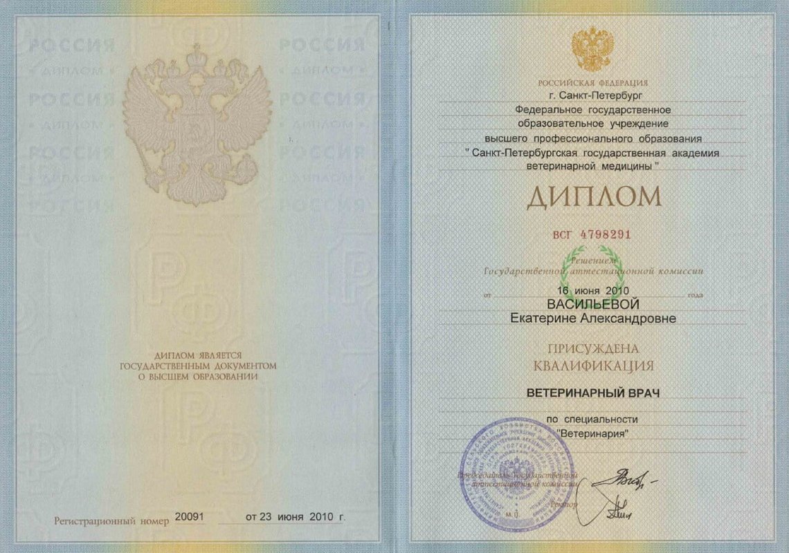 Окончила Санкт-Петербургскую Академию Ветеринарной медицины в 2010 г.